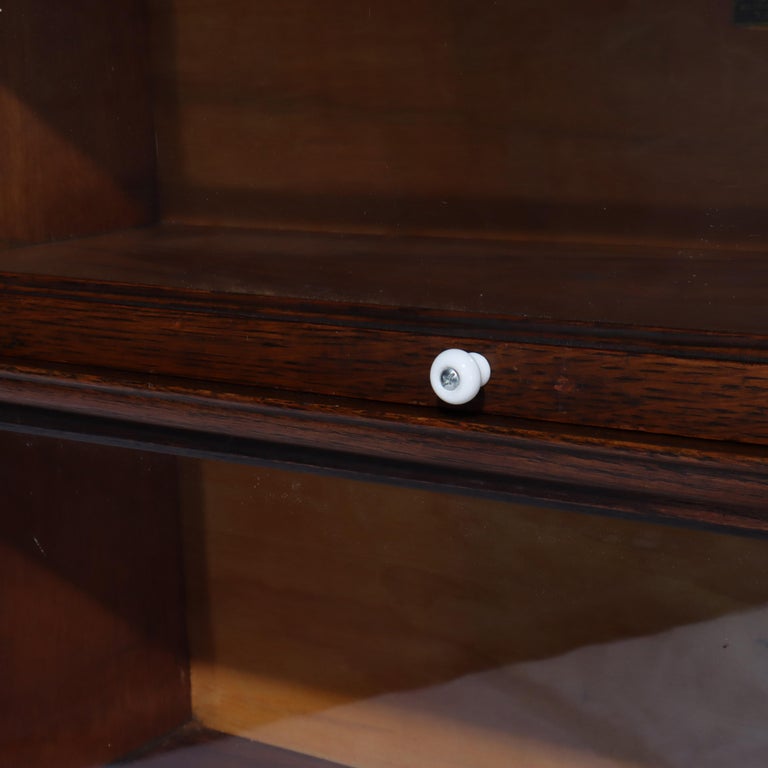 - A finely crafted antique barrister bookcase by Schram Bros., featuring three stackable sections. This piece is made from oak and showcases the Arts & Crafts style typical of the early 20th century. Each section has a glass front, allowing for easy display and access to books or collectibles. The bookcase is signed and dates back to circa 1920, reflecting the quality and design of the Globe Wernicke style.