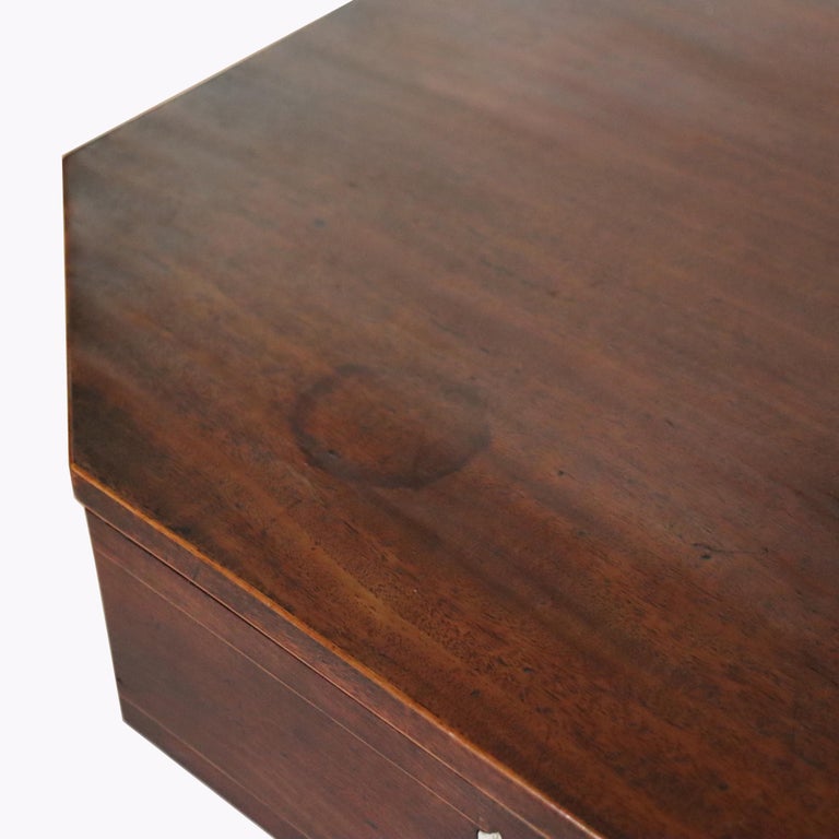 - This antique sewing stand, dating to circa 1820, is crafted in the Sheraton Federal style. Made from rich mahogany, it features a distinctive clip-corner design with lift top and is supported by gracefully curved spider legs. The piece showcases the refined craftsmanship and design aesthetics of early 19th-century furniture.