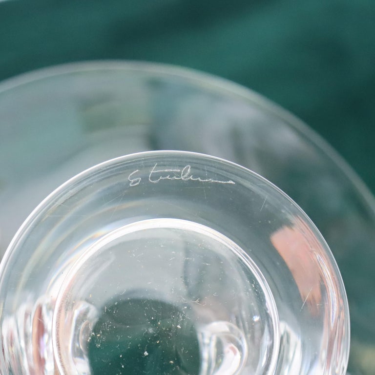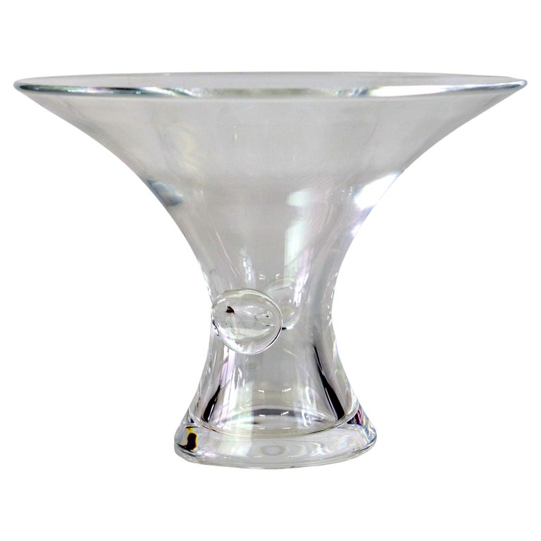 - A striking example of Steuben's mid-century modern art glass, this vessel showcases the brand's renowned craftsmanship. Signed and dated circa 1930, the piece features a sleek, clear glass design with a flared top and a pinched accent on the stem. Steuben, known for its high-quality glassware, often incorporated innovative techniques and elegant forms.