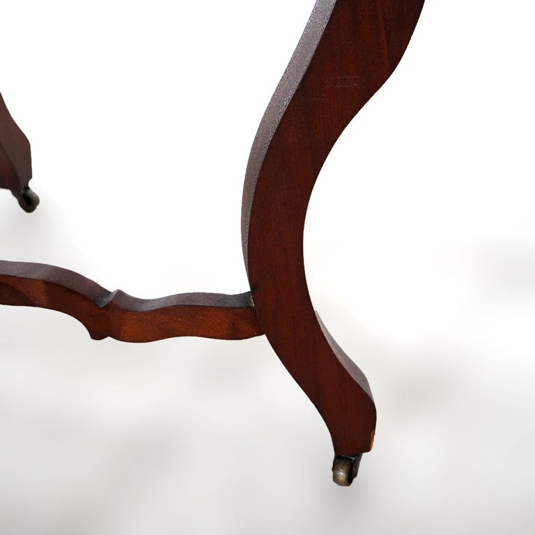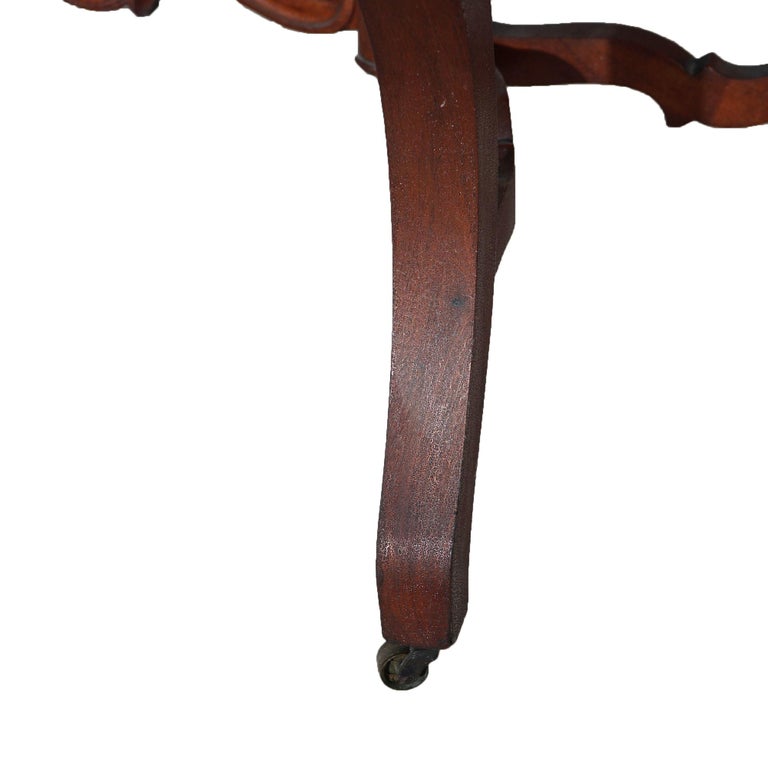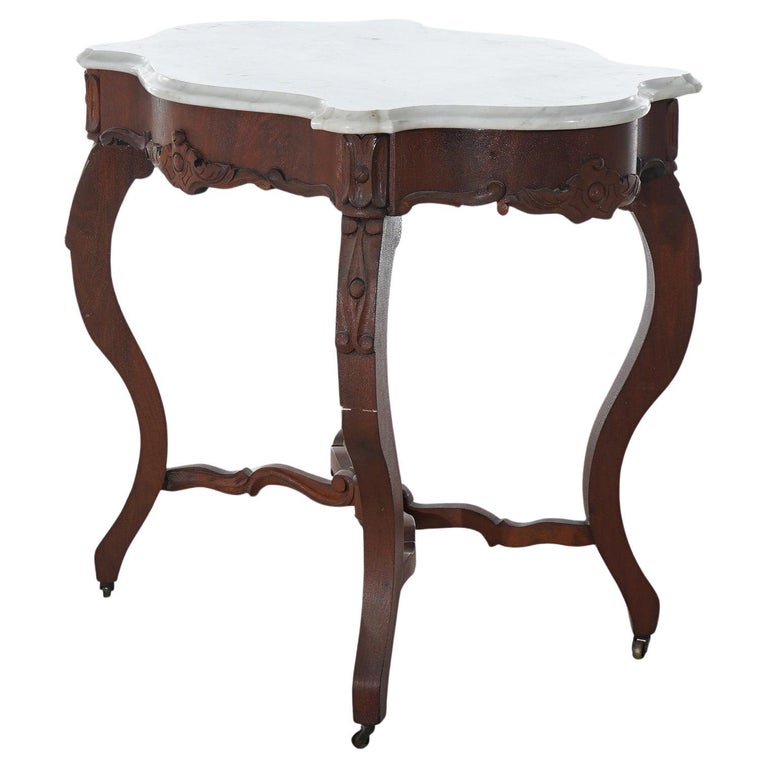 - An antique Victorian parlor table offers shaped and beveled marble turtle top over carved walnut base having floral accents and raised on cabriole legs with central urn form finial on stretcher, c1890
