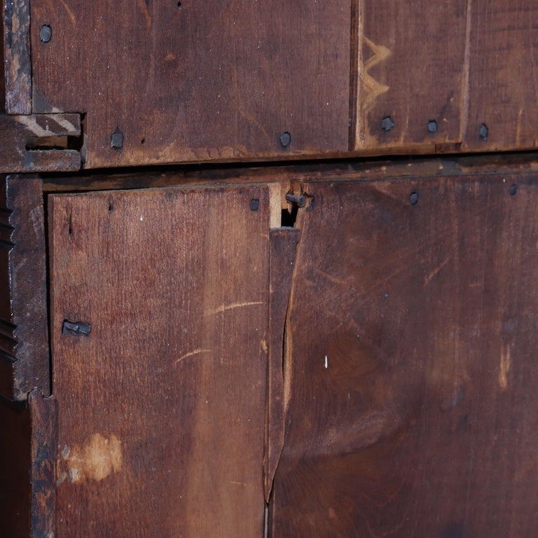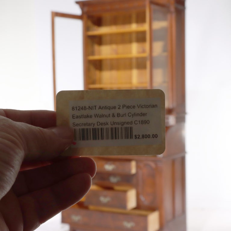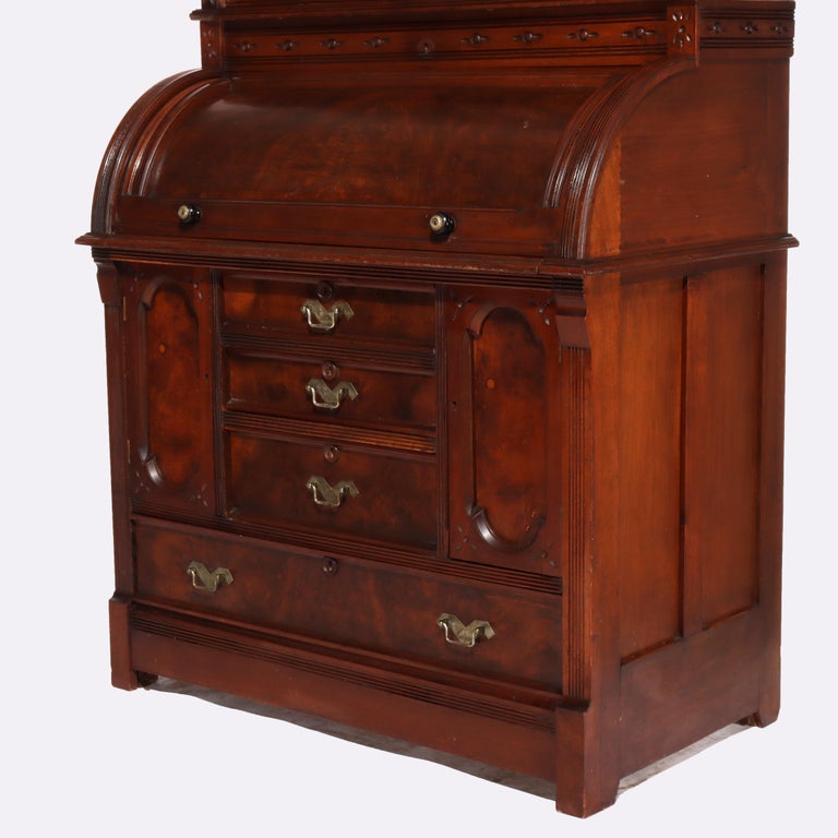- A fine example of Victorian Eastlake design, this two-piece secretary desk is crafted from rich walnut and burl wood. Dating to circa 1890, it features a distinctive cylinder roll-top that opens to reveal a writing surface and storage compartments. The upper section includes glass-fronted shelving, for displaying books or collectibles.
