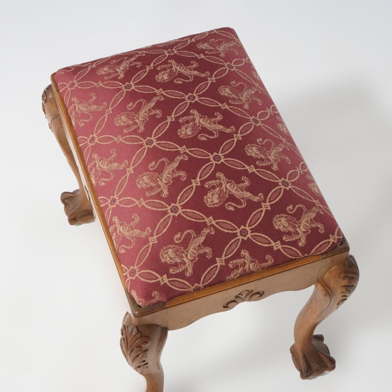 - A charming Chippendale style bench from the 20th century, crafted from oak. This piece features intricately carved claw feet and a decorative apron. The bench is topped with a cushioned seat upholstered in a rich, patterned fabric.