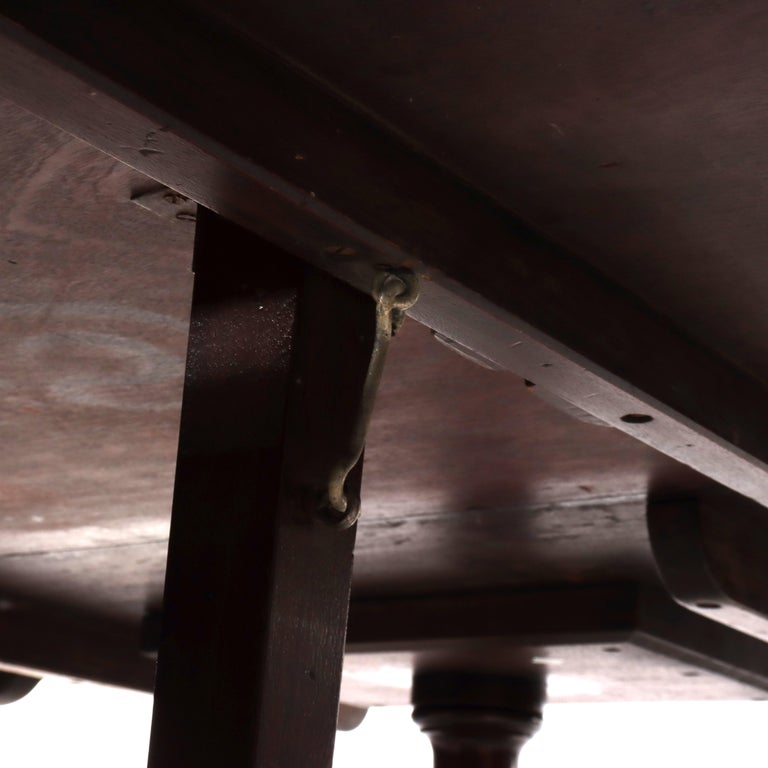 - A striking antique banquet table in the Duncan & Phyfe style, circa 1820. This George III mahogany table features three removable leaves, allowing for versatile use and seating arrangements. The table is supported by elegantly turned pedestals with splayed legs terminating in brass caps and casters, characteristic of the period's design.