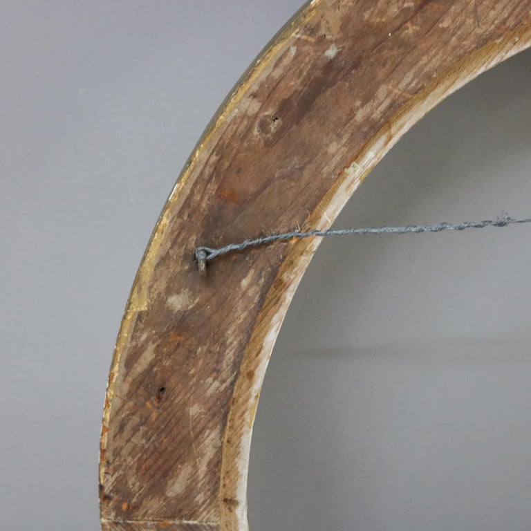 - A large antique oval frame crafted from carved gilt wood, dating to circa 1880. The frame features intricate detailing with ornate carvings and a rich gold finish, characteristic of the period's craftsmanship. Its elegant design makes it a perfect piece for displaying portraits or mirrors, adding a touch of historical charm to any setting.