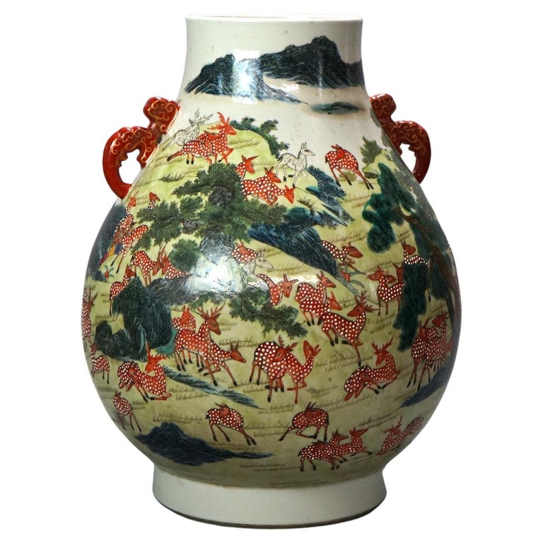 - Large Chinese Famille Rose Hu Figural Landscape Porcelain Vase with Figures, Animals, Double Dragon Handles & Qianlong Mark 20thC