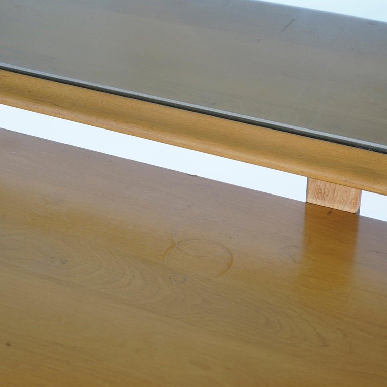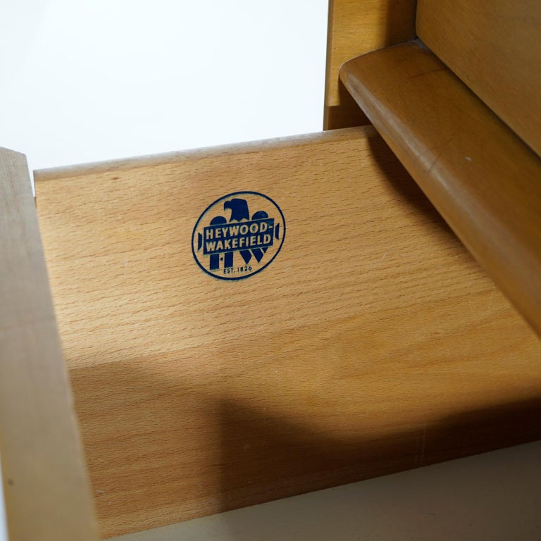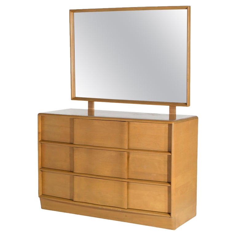 - Mid Century Modern Heywood Wakefield Dresser & Mirror offers Birch Construction in Wheat Finish with Three Long Drawers, Circa 1950