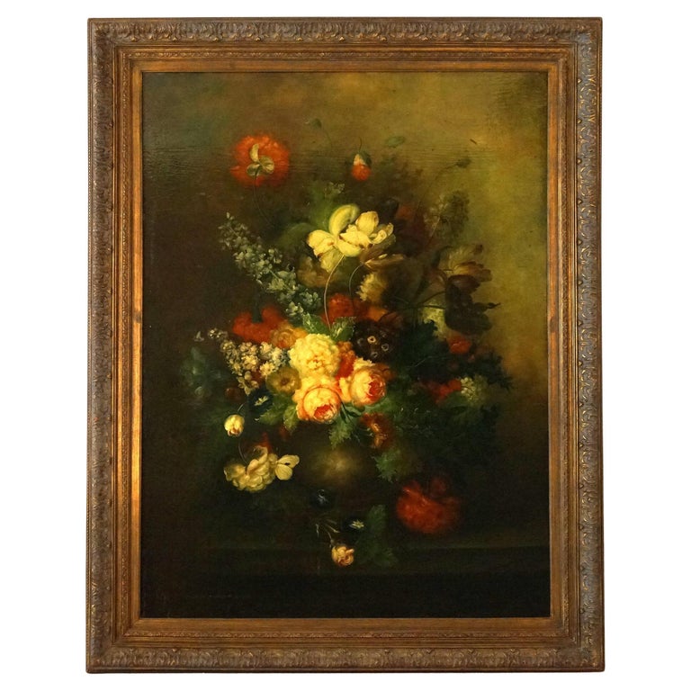 - A monumental painting offers oil on canvas floral still life with table top urn having garden flower arrangement including poppies and peonies, 20th century