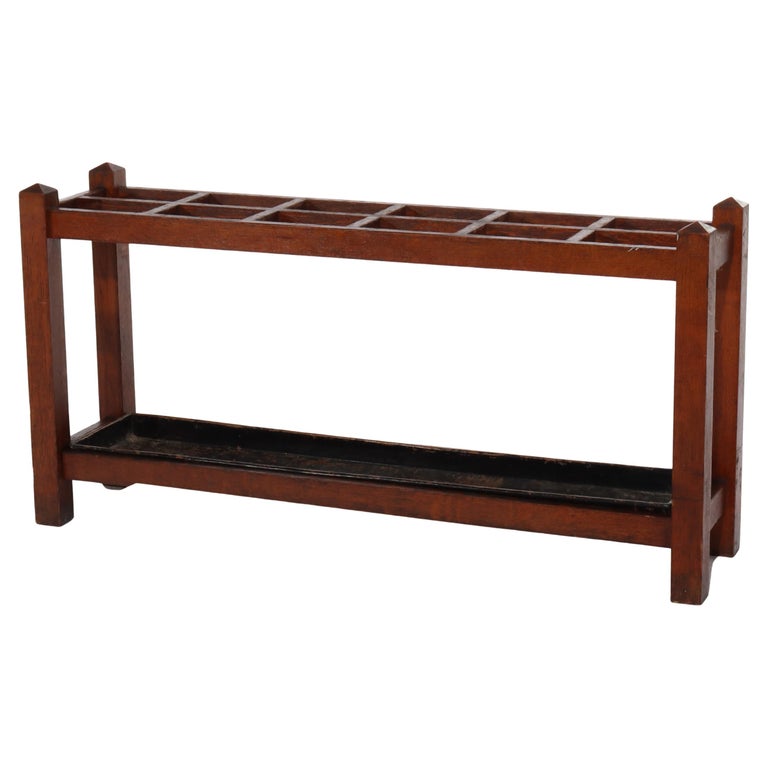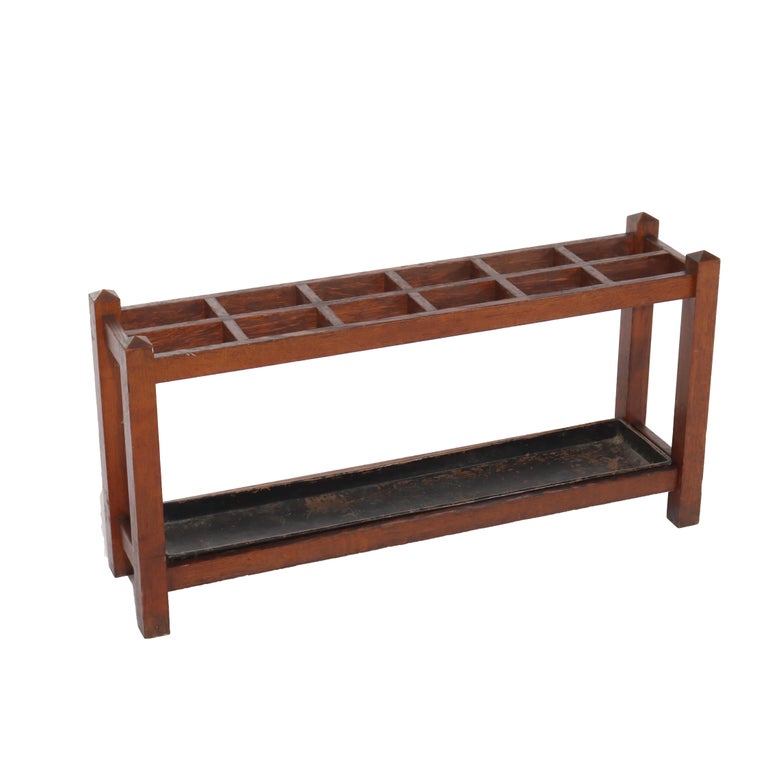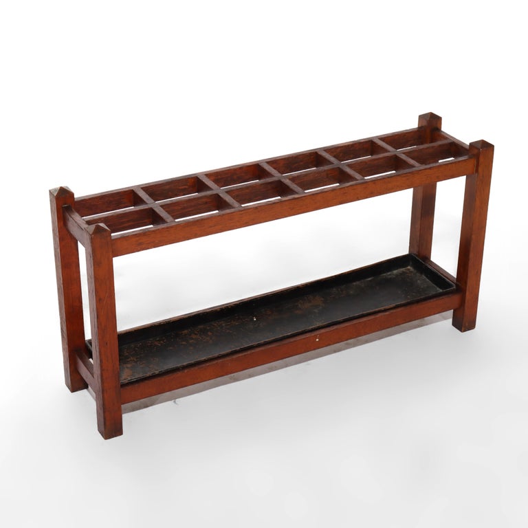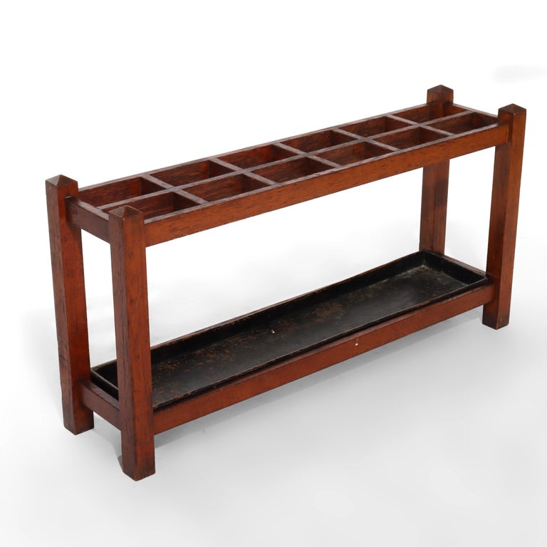 - An oversized oak umbrella stand in the manner of Stickley, dating to circa 1910. This piece exemplifies the Arts & Crafts movement with its simple, functional design and sturdy construction. Although unsigned, the craftsmanship is indicative of the Stickley style, known for its emphasis on quality materials and attention to detail. The stand features a grid-like top for organizing umbrellas and a lower tray to catch drips.