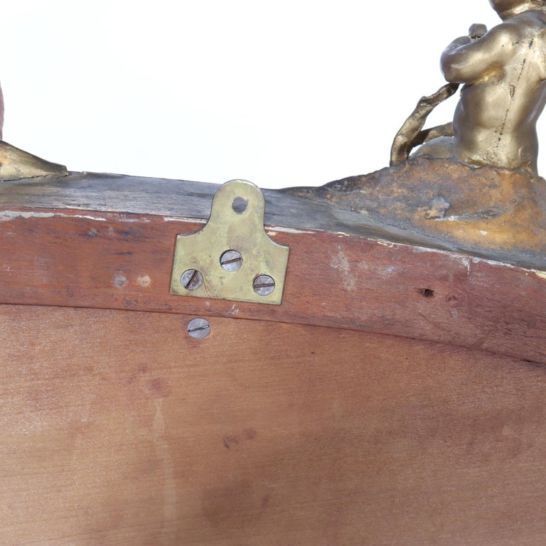 - This oversized antique Boston Classical gilt wood over mantle mirror, dating to circa 1860, features an exquisite design with cherubs and intricate detailing. The mirror showcases a finely crafted oval frame adorned with garlands and cherubic figures. Its classical design reflects the artistic sensibilities of the mid-19th century.
