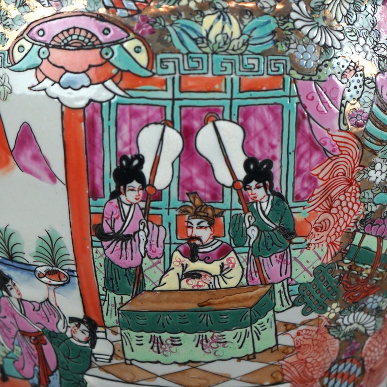 - Oversized Chinese Rose Medallion Enameled Porcelain Figural Covered Urn 20thC