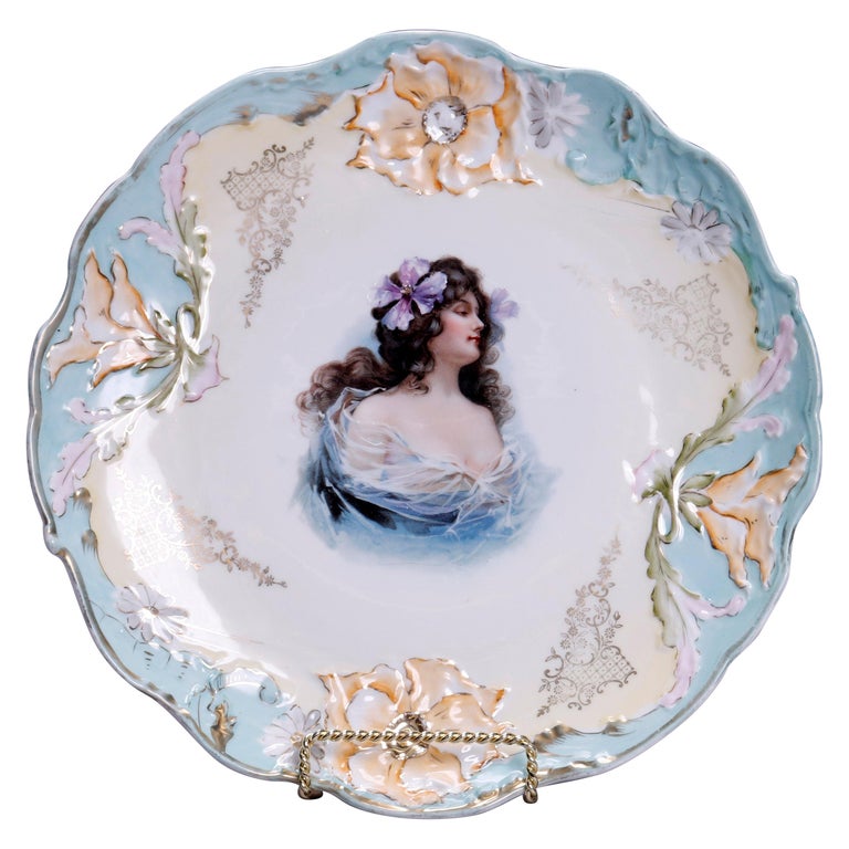 •Antique oversized Prussia portrait plate features well with central portrait of young woman, rim with embossed foliate elements and scalloped edges, decorated with blue and gilt foliate motif, 19th century