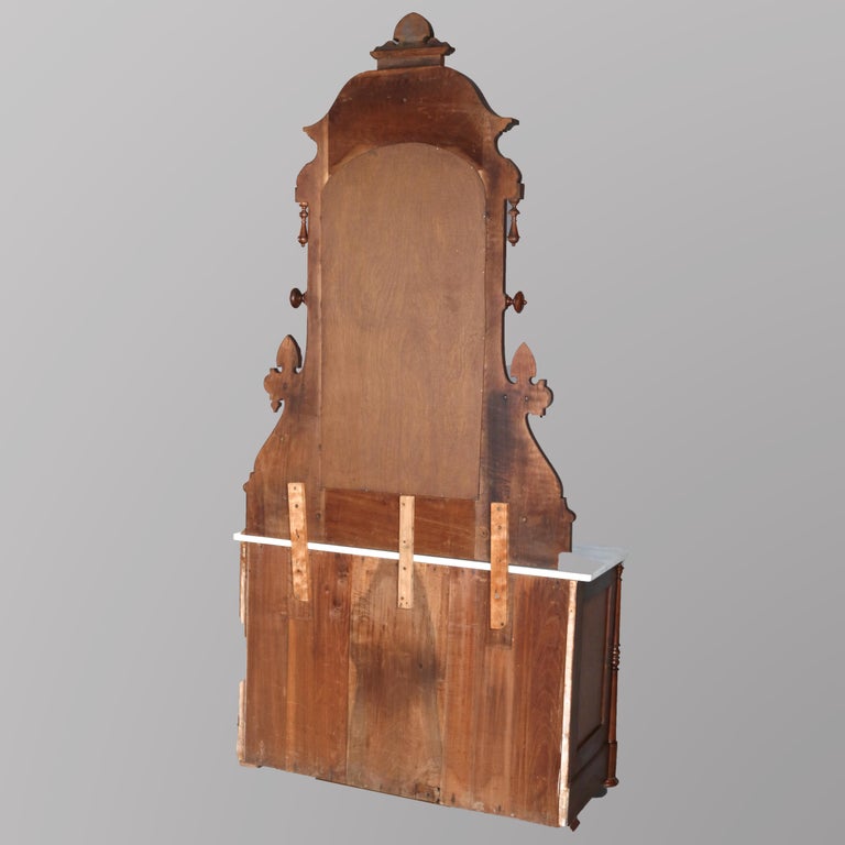 •An antique Victorian Renaissance Revival chest of drawers offers walnut construction with tall mirror having shaped frame and burl panels with stylized urn form cartouche, pierced palmette crest and flanking tear drop finials and candle stands with carved palmettes, surmounting marble top walnut chest having three graduated drawers with burl panels and tear drop pulls, circa 1880